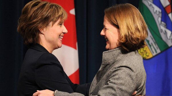 B.C. Premier Christy Clark, left, and Alberta Premier Alison Redford embrace after a joint press conference in Calgary on Oct. 21, 2011.