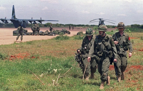 Members of the Canadian Airborne Regiment get into position as they arrive to assume responsibility for the airport at Bali Dogle, Somalia, on December 15, 1992.Andrew Vaughan