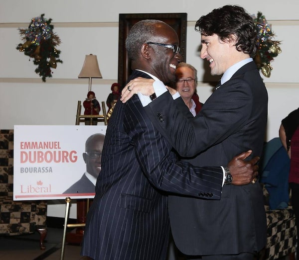 Liberal leader Justin Trudeau, right, greets candidate Emmanuel Dubourg, as he arrives to participate in a campaign rally in the Montreal riding of Bourassa on Nov. 12, 2013.CHRISTINNE MUSCHI/The Globe and Mail