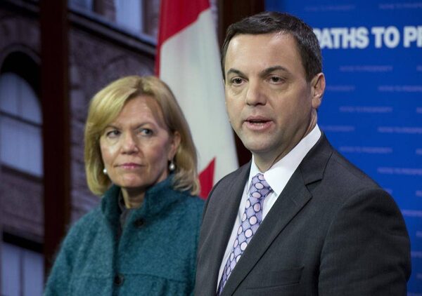 Ontario PC Leader Tim Hudak, right, and Christine Elliott speak to reporters at Queen's Park in Toronto on Thursday, Feb. 7, 2013.FRANK GUNN/The Canadian Press