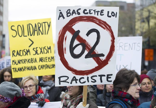 Protesters opposing Bill 62 and racism march during a demonstration in Montreal on Nov. 12, 2017.Graham Hughes/The Canadian Press
