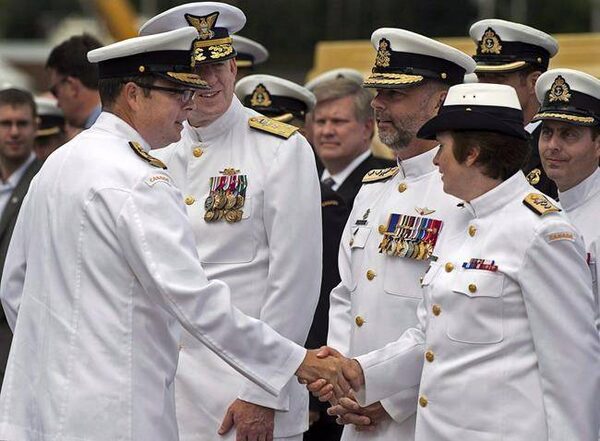 Vice Admiral Mark Norman, left, greets officers at a change of command ceremony in Halifax on July 12, 2013.The Canadian Press