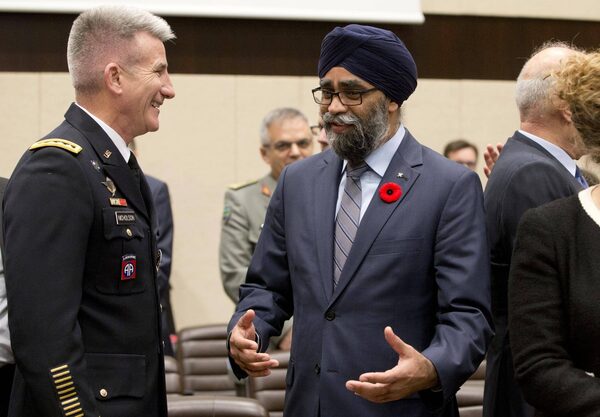 Canadian Defense Minister Harjit Singh Sajjan, center, speaks with U.S. top commander in Afghanistan US Army General John Nicholson during a round table meeting of NATO defense ministers and Resolute Support operational partner nations at NATO headquarters in Brussels on Thursday, Nov. 9, 2017.Virginia Mayo/The Associated Press