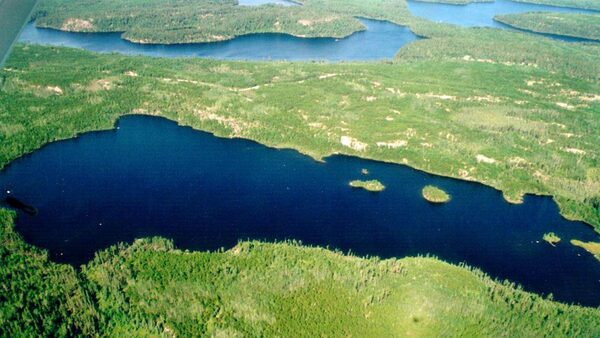 An aerial photograph shows one of the many bodies of water used for research in Northewestern Ontario's government-run Experimental Lakes Area