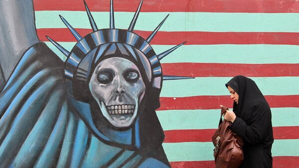 An Iranian woman walks past an anti-U.S. mural painted on the wall of the former American embassy in Tehran on Nov. 19, 2011.ATTA KENARE/AFP / Getty Images