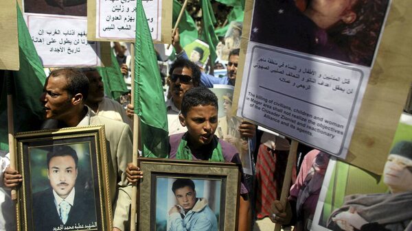 In this photo taken on a government-organized tour, people hold photos of dead relatives during a protest in front of the Hungarian embassy in Tripoli, Libya, Thursday, Aug. 11, 2011.Dario Lopez-Mills/The Associated Press