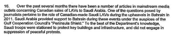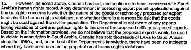 Critics of the deal have suggested the Saudis might use the Canadian vehicles against civilians. The report acknowledges these concerns, but says "we do not believe that the proposed exports would be used to violate human rights in Saudi Arabia."