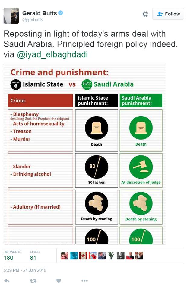 During the federal election campaign, soon-to-be Prime Minister Justin Trudeau told reporters that the deal with the Saudis was merely a sale of "jeeps" to Riyadh. In opposition, however, the Liberals were frequent critics of the deal's secrecy and Saudi Arabia's human-rights record. In particular, Mr. Trudeau's top adviser and current principal secretary, Gerald Butts, frequently attacked Mr. Harper's government on social media for its close ties to the Saudis.