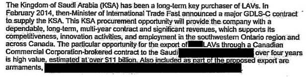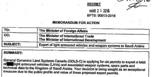The Global Affairs Canada memo, marked "secret," was released by the Justice Department on Tuesday in connection with a lawsuit led by a University of Montreal law professor. Daniel Turp alleges that an arrangement to sell light-armoured vehicles to Saudi Arabia – which has a notoriously poor human-rights record, and has been suspected of using Canadian-made LAVs in its proxy war against Iranian-backed rebels in Yemen – is illegal, and is challenging the deal in Federal Court. (Here's an explanation from The Globe's Steven Chase of what that deal entails, how Stephen Harper's Conservative government brokered it and why it's so controversial.)
