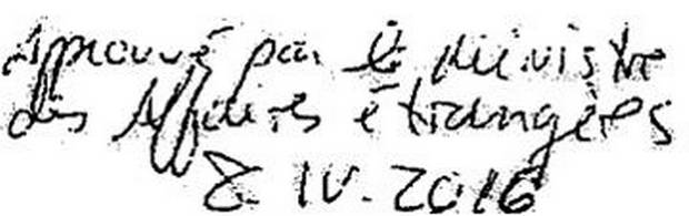A note scrawled across the memo in French reads: "Approved by the foreign affairs minister April 8, 2016."