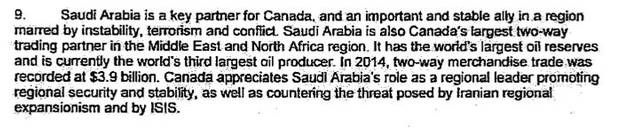 The federal government is front and centre in the deal with Saudi Arabia, which the memo calls a "key partner for Canada, and an important and stable ally in a region marred by instability, terrorism and conflict."