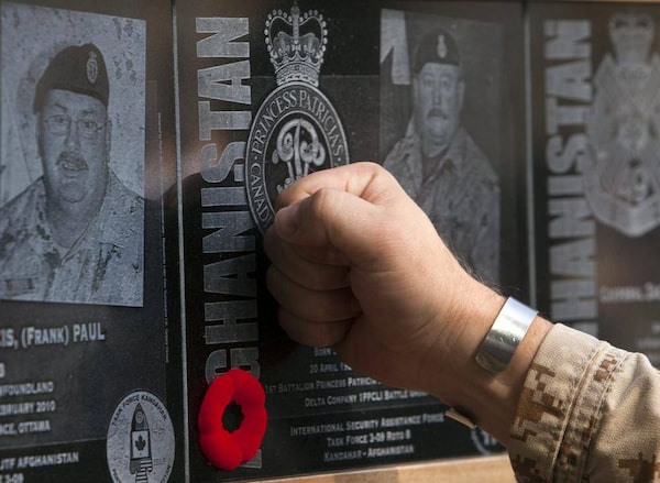 A soldier touches the plaque of a fallen comrade at the war memorial at Kandahar Air Field on Nov. 11, 2011.RYAN REMIORZ/The Canadian Press