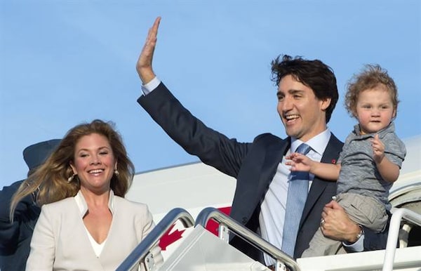 Prime Minister Justin Trudeau, holding his son Hadrian, waves as he steps off the plane with his wife Sophie Gregoire-Trudeau during a welcome ceremony at Andrews Air Force Base, Md., Wednesday, March 9, 2016.Paul Chiasson/The Canadian Press