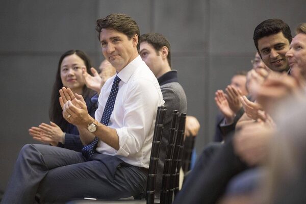 Prime Minister Justin Trudeau listens to introductions before joining Peter Baker, Chief White House Correspondent of the New York Times and Catherine Porter, Toronto Bureau Chief for The New York Times, for a panel discussion in Toronto, on June 22, 2017.Chris Young/The Canadian Press