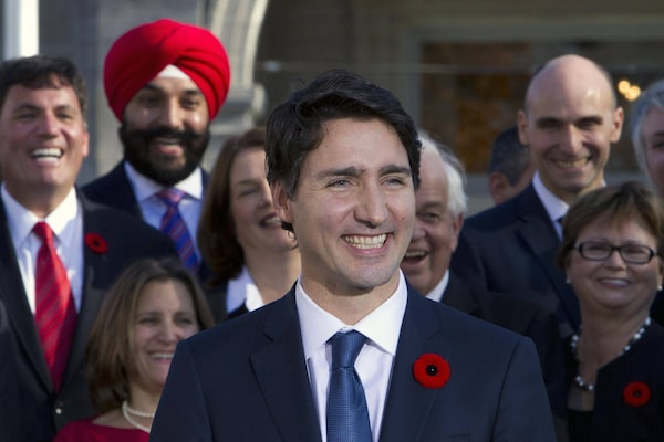 Prime Minister Justin Trudeau holds a news conference with his cabinet after they were sworn-in at Rideau Hall in Ottawa on Wednesday. Trudeau's succinct ‘because it's 2015’ explanation of his new, half-female cabinet has attracted international attention.FRED CHARTRAND/The Canadian Press