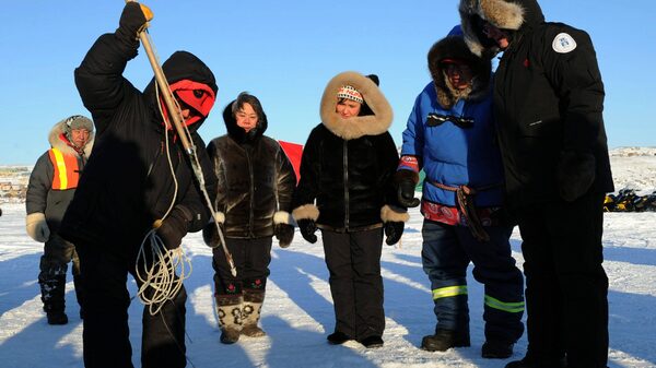 From right: Prime Minister Stephen Harper Canadian Ranger Dinos Tikivik, Health Minister Leona Aglukkaq and Nunavut Premier Eva Aariak watch as Moses Atagooyuk gives a seal hunting demonstration in Iqaluit, Nunavut, on Feb. 23, 2012.Sean Kilpatrick/THE CANADIAN PRESS