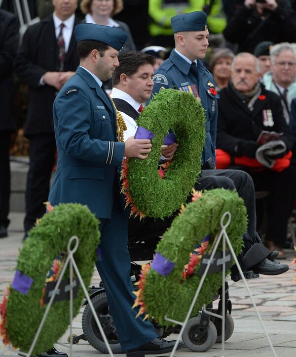 Minister of Veterans Affairs Kent Hehr (centre) places a wreath during the Remembrance Day ceremony at the National War Memorial in Ottawa on November 11, 2015.Sean Kilpatrick/The Canadian Press
