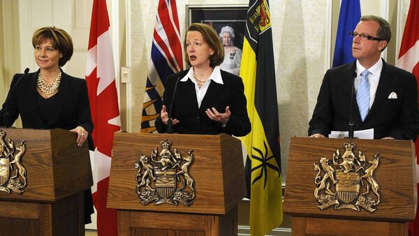 British Columbia Premier Christy Clark (L), Alberta Premier Alison Redford (C) and Saskatchewan Premier Brad Wall (R) address the media after a meeting in Edmonton on Dec. 13, 2011.DAN RIEDLHUBER