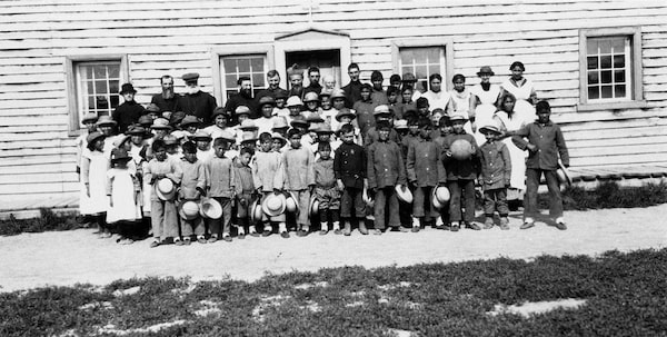 Children and staff at a residential school in Fort Providence, NWT in 1921. The Canadian government funded such institutions from the 1870s to the 1990s, which saw more than 150,000 children taken from their homes.
