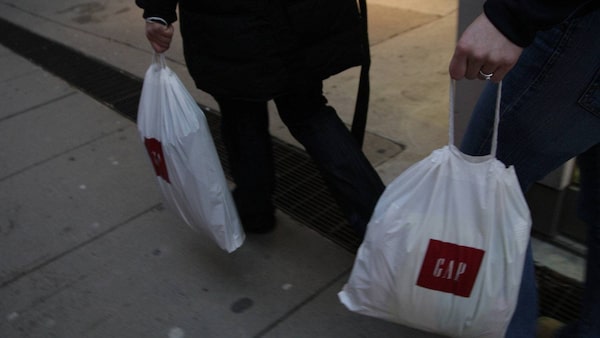 Plastic bags from Gap store are carried by people shopping on Bloor St., Toronto.Fernando Morales/The Globe and Mail