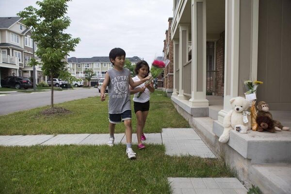 Diego and Camila Ruiz, 8 and 6, bring flowers to the Milton, Ont., home where a two-year-old boy died of heat stroke on Wednesday after spending considerable time in a very hot car.Matthew Sherwood/The Globe and Mail