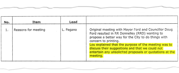 During May and June of 2011, Toronto Mayor Rob Ford and his brother Doug, councillor for Ward 2, took an active role in discussions between a large Chicago-based printing company, RR Donnelley, and the city’s purchasing officials, about the possibility of outsourcing municipal printing functions. The talks began with two meetings between Councillor Ford and Barry Waddick, Donnelley’s director of sourcing services, on May 3 and June 9.