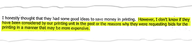 On June 30, five Donnelley executives, including Mr. Waddick, met with several city purchasing officials to continue the discussion about the municipal printing operations. Mr. Ford asked to be kept apprised of the discussions. In minutes obtained by The Globe, Donnelley executives pointed out that the earlier meetings with the Fords resulted in a proposal for "a better way for the city to do things with concern to printing." They added that Mr. Ford toured one of their facilities. Donnelley president Allan Hallis said the firm was also interested in outsourcing the printing for all the city’s agencies, boards and commissions, and offered to do a $20,000 study on potential savings as a pot sweetener. “If they found there were no cost savings, the report would be free,” the minutes noted.