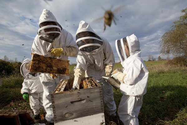 The kids are oddities in their neighbourhood of Leaside, where most of their peers might run screaming across the backyard at the sight of a bee. Norah and Calvin barely flinch around them, having made a dozen trips a year to the the hives behind their grandparents' home in Collingwood, Ont., two hours north of Toronto. When a cluster of about a dozen bees landed on the back of Calvin's suit earlier in the afternoon, Norah calmly brushed them off with her gloved hand, as though they were crumbs.