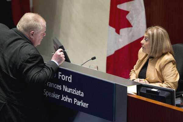 Toronto Mayor Rob Ford talk with Speaker Frances Nunziata at City Hall on Nov 13, 2013.MOE DOIRON/The Globe and Mail