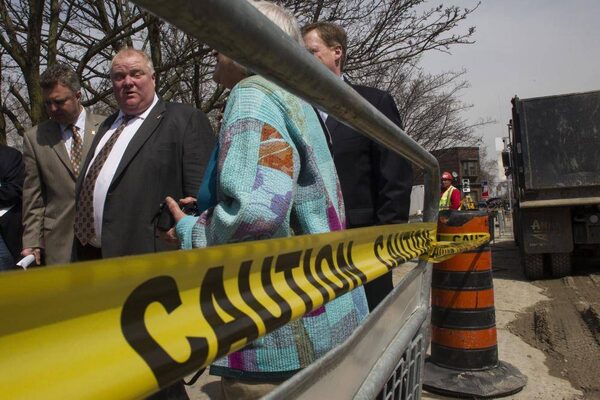 Toronto’s Mayor Rob Ford walks past a road construction site in the cit's east end after discussing plans for road construction work with the media on April 9, 2013.