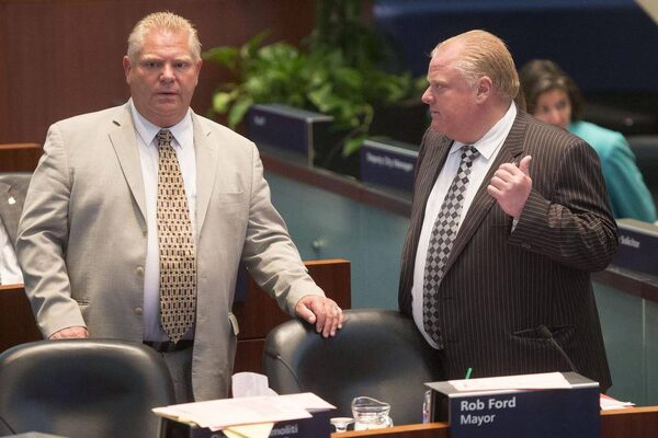 Toronto Mayor Rob Ford (right) talks to his brother Councillor Doug Ford as they attend the last council meeting of this term at City Hall on Monday August 25, 2014.Chris Young/The Globe and Mail