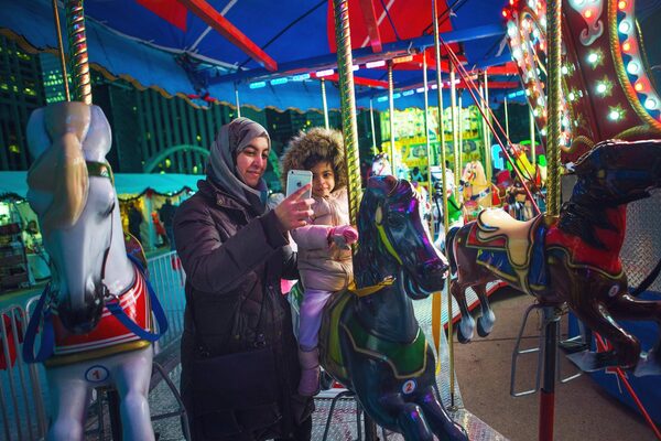 Thuraya Albusaidi and her daughter Noof Albusaidi take a photo on the merry-go-round during the Holiday Christmas Market at Nathan Philips Square in Toronto on December 10, 2016.Jennifer Roberts/The Globe and Mail