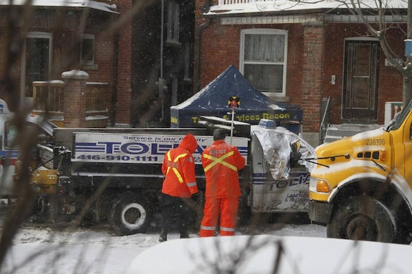 Toronto police officers from the task force collect evidence on Keele Street, south of Dundas where the driver of a stolen snow plow was shoot by police after hitting another officer with the vehicle, Toronto Jan. 12, 2011.Fernando Morales/The Globe and Mail