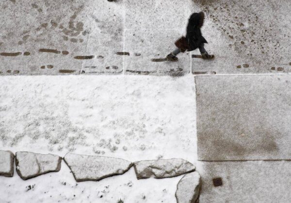 A pedestrian leaves foot prints on the sidewalk as light snow falls over Toronto, Ontario, April 11, 2013.HYUNGWON KANG/Reuters