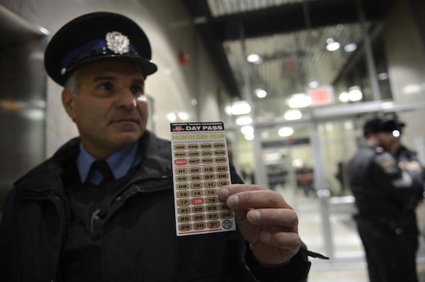 Depending on who you ask, fare evasion is either a big problem or a huge problem. Employees say just about every method of payment has been compromised, including the sort of day-pass displayed here by Transit enforcement officer Bill Perivolaris. But TTC officers have their own tricks – monitoring body language as people pay and checking for signs of forgery.Fred Lum/The Globe and Mail
