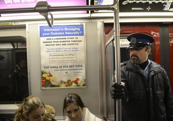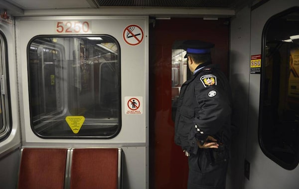 TTC Transit Enforcement officer Carlos Uncao riding a subway car.Fred Lum/The Globe and Mail