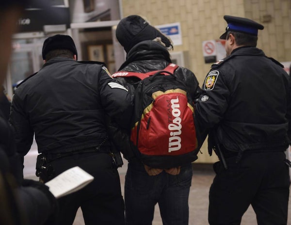 A young man is led into Davisville station in cuffs after trying to dodge paying the fare and allegedly assaulting a TTC enforcement officer when challenged. The officer elected not to pursue an assault charge, noting that the distraught suspect had no record and might learn from the incident. But the 22-year-old from California would still have to pay a hefty fine for trying to sneak onto TTC property.Fred Lum/The Globe and Mail