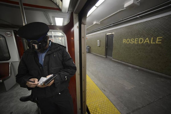 TTC Transit Enforcement Officer Carlos Uncao writes up notes while riding a southbound Yonge subway. Downsizing in recent years and recent firings last month have brought the number of TTC patrol officers down to 34. A typical Friday night may have only eight officers patrolling.Fred Lum/The Globe and Mail
