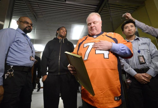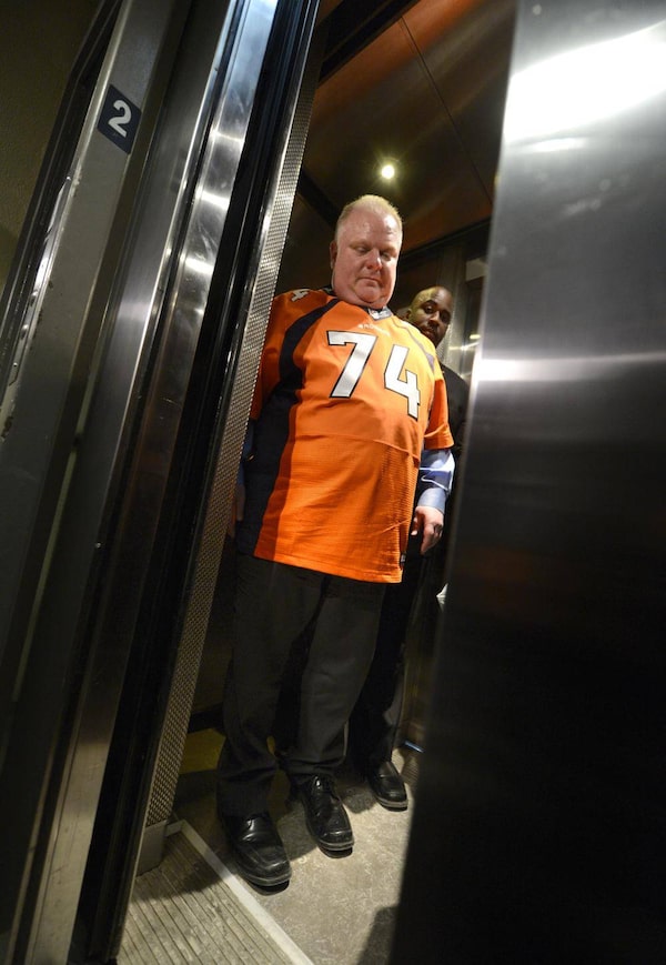 Toronto Mayor Rob Ford holds the elevator door for people on Feb. 11 2014. Earlier the mayor let with denver Bronco offensive lineman Olrando Franklin as well as presenting him Franklin with a plaque for representing Toronto at the recent Super Bowl game.Fred Lum/The Globe and Mail
