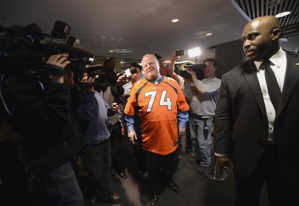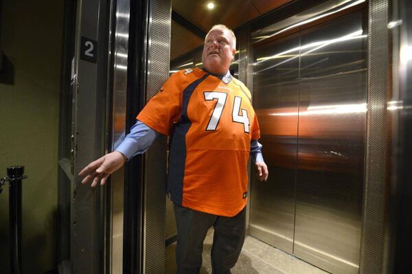 Toronto Mayor Rob Ford wears his Denver Broncos jersey as he stands inside the elevator at City Hall on Feb. 11 2014. The Mayor met with Denver Bronco offensive lineman Orlando Franklin, ho grew up in Scarborough and played in the recent Super Bowl football championship game.Fred Lum/The Globe and Mail