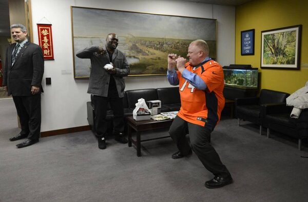 Mayor Rob Ford meets with Denver Broncos player Orlando Franklin. The Broncos played in the recent Super Bowl Champioinship game and Ford cheered them on.