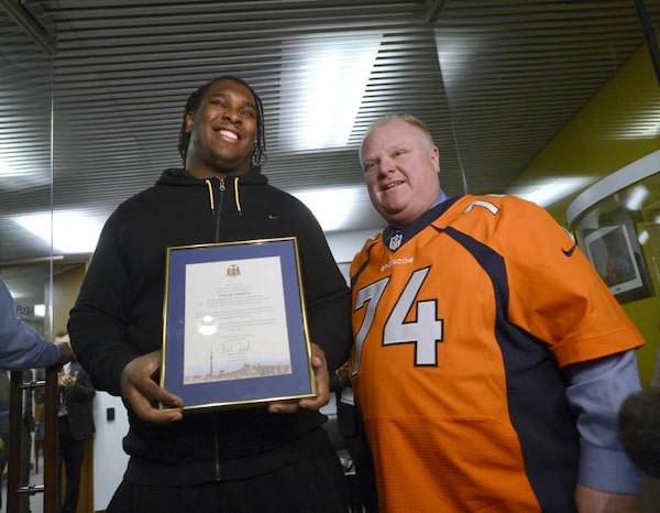 Denver Bronco offensive lineman Orlando Franklin (LEFT) met with Toronto Mayor Rob Ford on Feb. 11 2014. The Mayor came out wearing a Denver Bronco's Jersey with Franklin's number on it and presented Franklin (who grew up in Scarborough) with a plaque for representing the city of Toronto during the recent Super Bowl football championship game.Fred Lum/The Globe and Mail