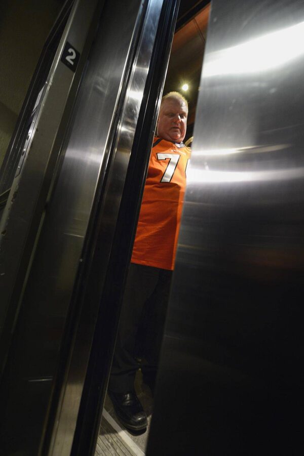 Toronto Mayor Rob Ford stands inside as the elevator door closes as he takes people downstairs on Feb. 11 2014. The Mayor met with Denver Bronco offensive lineman Orlando Franklin, ho grew up iN Scarborough and played n the recent Super Bowl football championship game.Fred Lum/The Globe and Mail