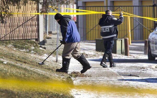 An investigator uses a metal detector and later sifts through collected debris from a lawn at the scene on a street in Brampton, Ont., on Jan. 24, 2013 where a 9-year old boy was shot late Wednesday evening, and later died of his injuries.Peter Power/The Globe and Mail