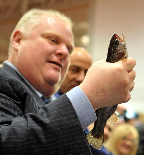 Mayor Rob Ford holds a fish he caught in a trout pond at the Toronto Sportsmen's Show at the Direct Energy Centre on Feb. 7, 2013.J.P. Moczulski/The Globe and Mail