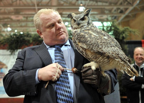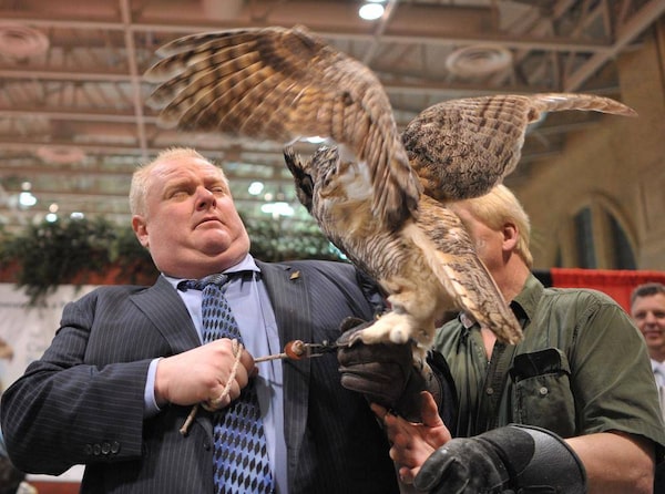 Mayor Rob Ford holds a great horned owl named Alexandra at the Toronto Sportsmen's Show at the Direct Energy Centre on Feb. 7, 2013.J.P. Moczulski/The Globe and Mail