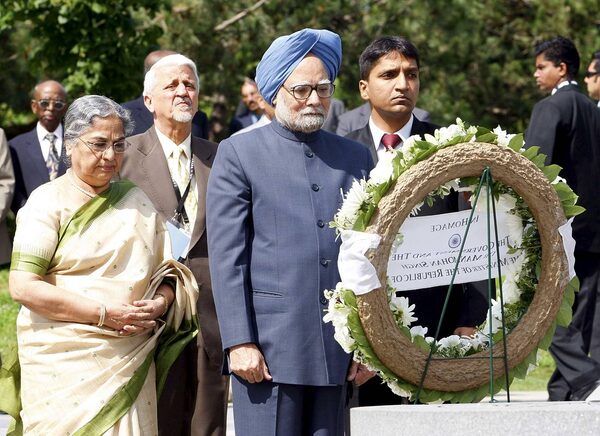 Indian Prime Minister Manmohan Singh (C) and his wife Gursharan Kaur (L) lay a wreath at the Air India memorial in Toronto June 28, 2010. Air India Flight 182 left Toronto on June 23, 1985 and exploded in the sky off the Irish coast, killing all 329 people aboard.MIKE CASSESE