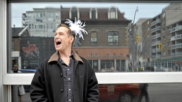 Comedian Scott Thompson wears a feather tiara after suggesting Drag Day as his big idea for Toronto, on Queen Street West, Friday April 29, 2011
