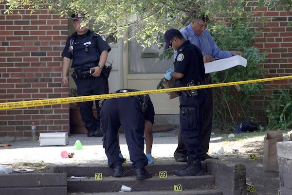 The Toronto Police Forensic Identification Unit collects evidence from the shooting scene at a housing complex at Morningside Avenue and Danzig Street in Toronto, June 17, 2012 following a gun battle that left more than 20 people shot including two who were killed while attending a block party on Monday night.Deborah Baic/The Globe and Mail
