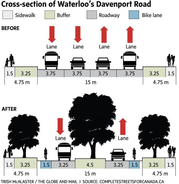 This four-lane road averaged 16 collisions a year from 2004 to 2008, according to TCAT, and most people drove at more than 70 kilometres an hour. A makeover added a painted bike lane and a median (which sometimes gave way to a turn lane), while cutting in half the space for auto traffic. Greenery was added, transit shelters were improved and a pedestrian crossing was made safer. The result? Average vehicle speeds dropped and the number of collisions was cut by one-quarter.